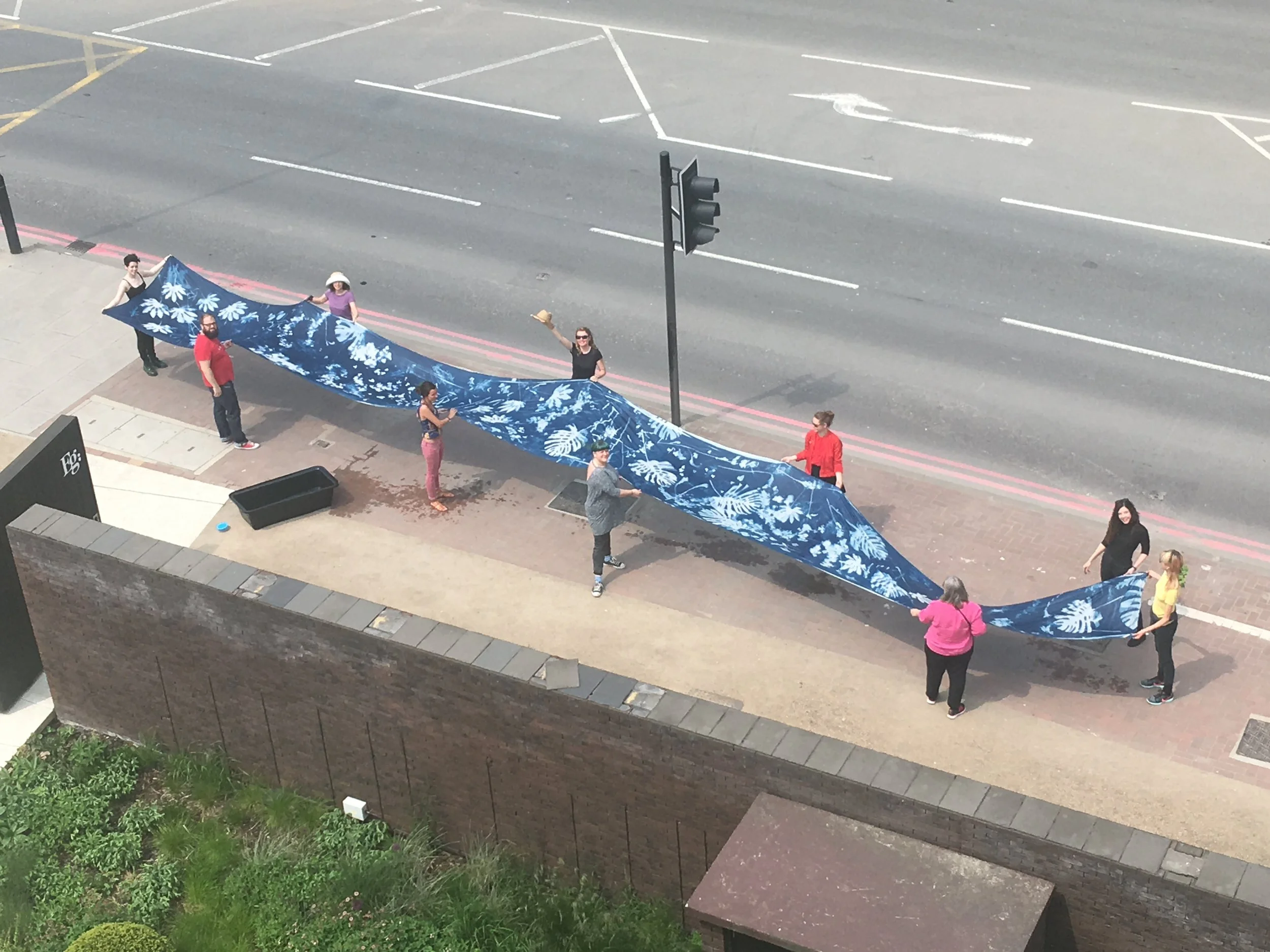 Blumen Chelsea Flower Show Fringe, 2016Silva, along with Melanie King, Eva Sajovic, Alice Cazenave and Liz Gorman created a fifteen metre long cyanotype print on fabric using sunlight and discarded flowers from Covent Garden Flower Market. View fullsize View fullsize View fullsize View fullsize