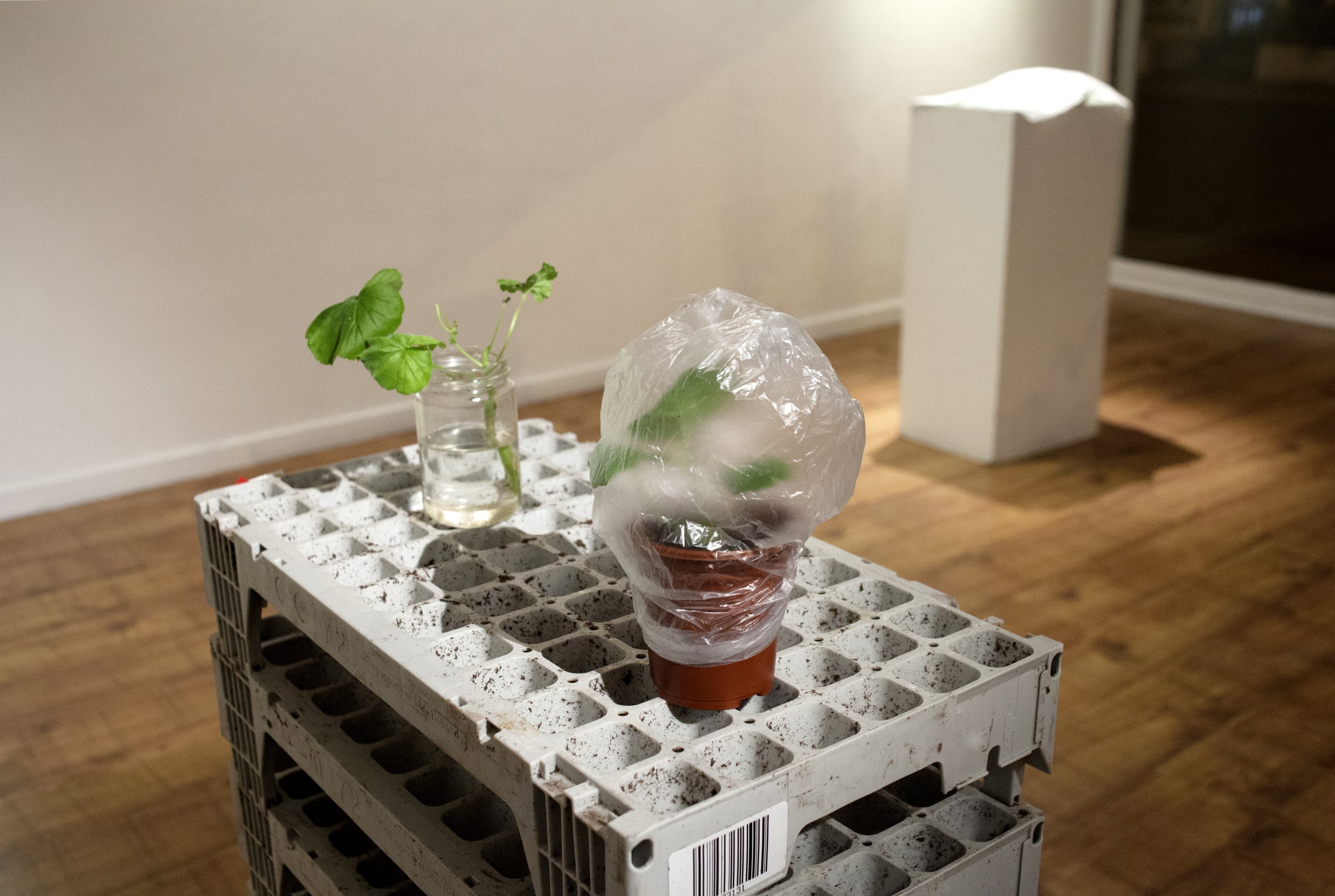 Silva and Sajovic brought The Red Jan Line – descendants of Corinne’s grandmother Janet’s geraniums – into contact with one thousand plug plant geraniums bought from a wholesaler in the Netherlands. These plants (in diminished numbers) were then included in the installation Five Hundred Flowers and the Mother Plant at UAL’s London College of Communication before being absorbed into the Grow Elephant Community Garden (now closed). The loss of the plants is recorded in Counting performance for video.